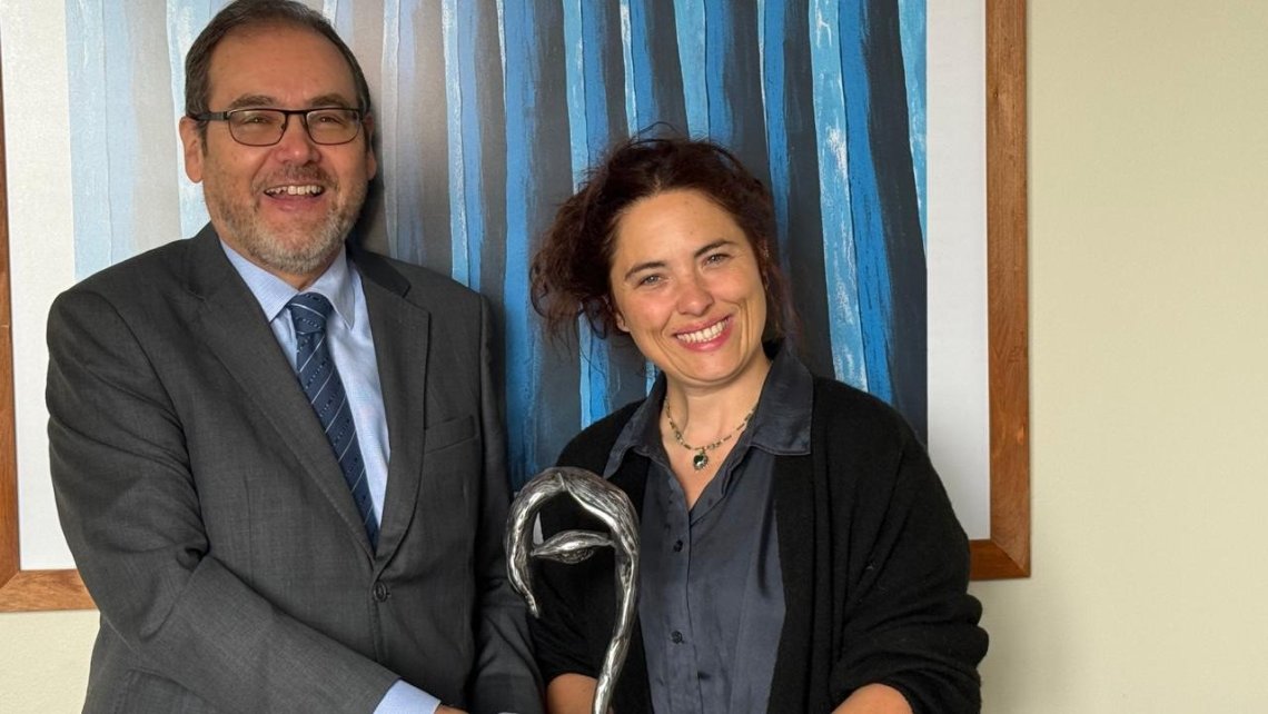 El director de la DIRAC, el embajador Mauricio Hurtado, entrega el Premio Florencio 2025 a la directora y dramaturga chilena Soledad Cruz.